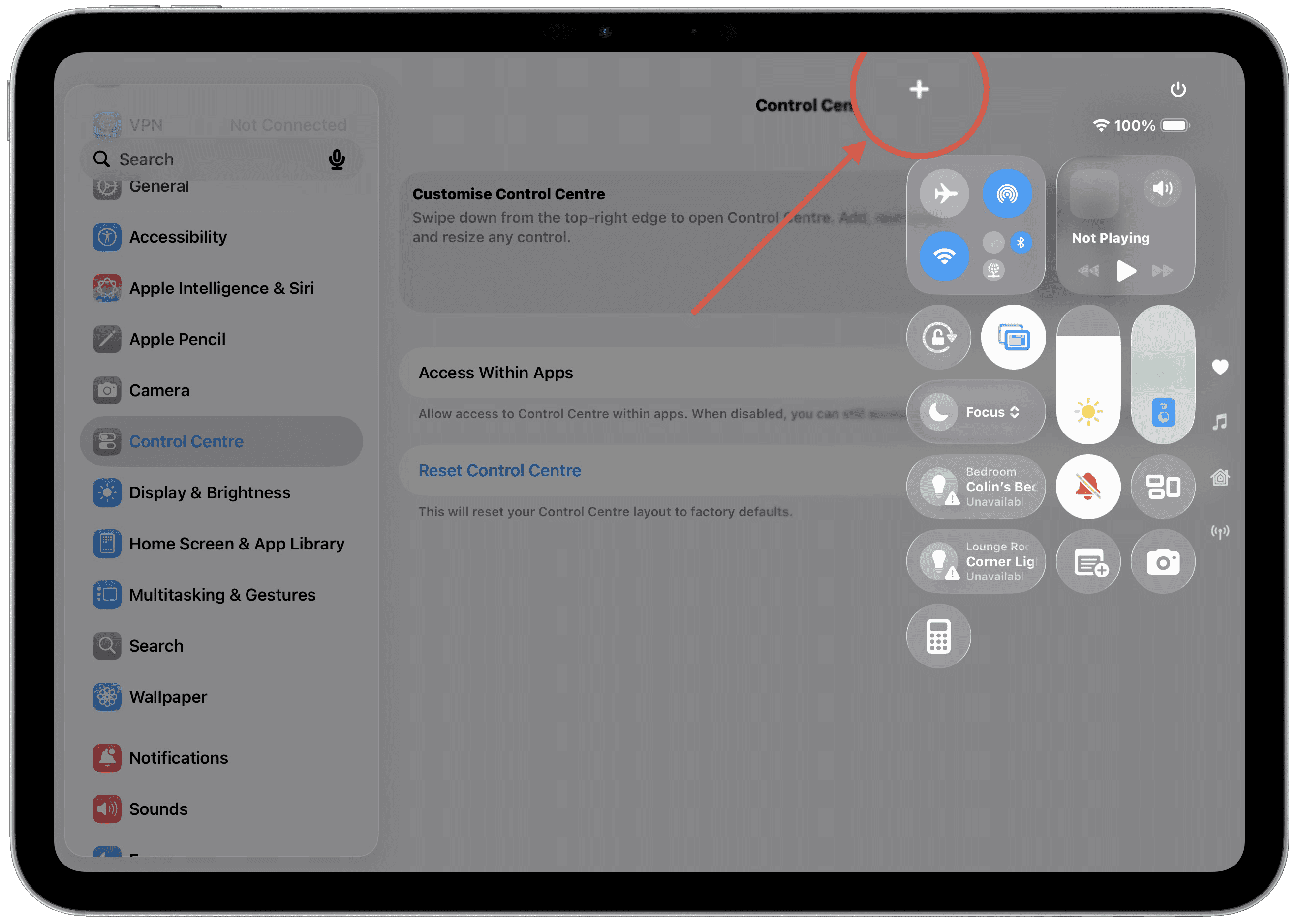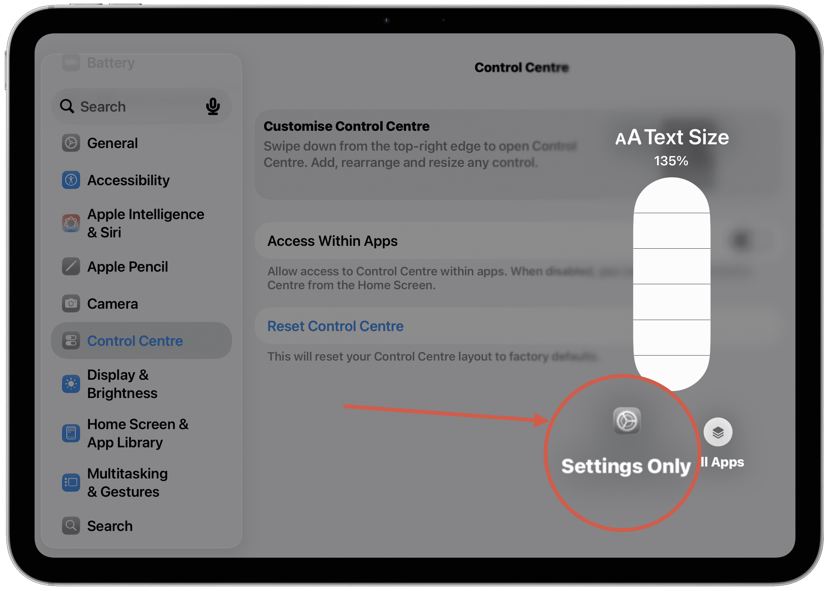 1. Access Control Centre by swiping down from the top right corner of your iPad or iPhone from any screen. You do not need to be in the Settings app. If it doesn't work you may need to open Settings > Control Centre and make sure "Access Within Apps" is turned on.