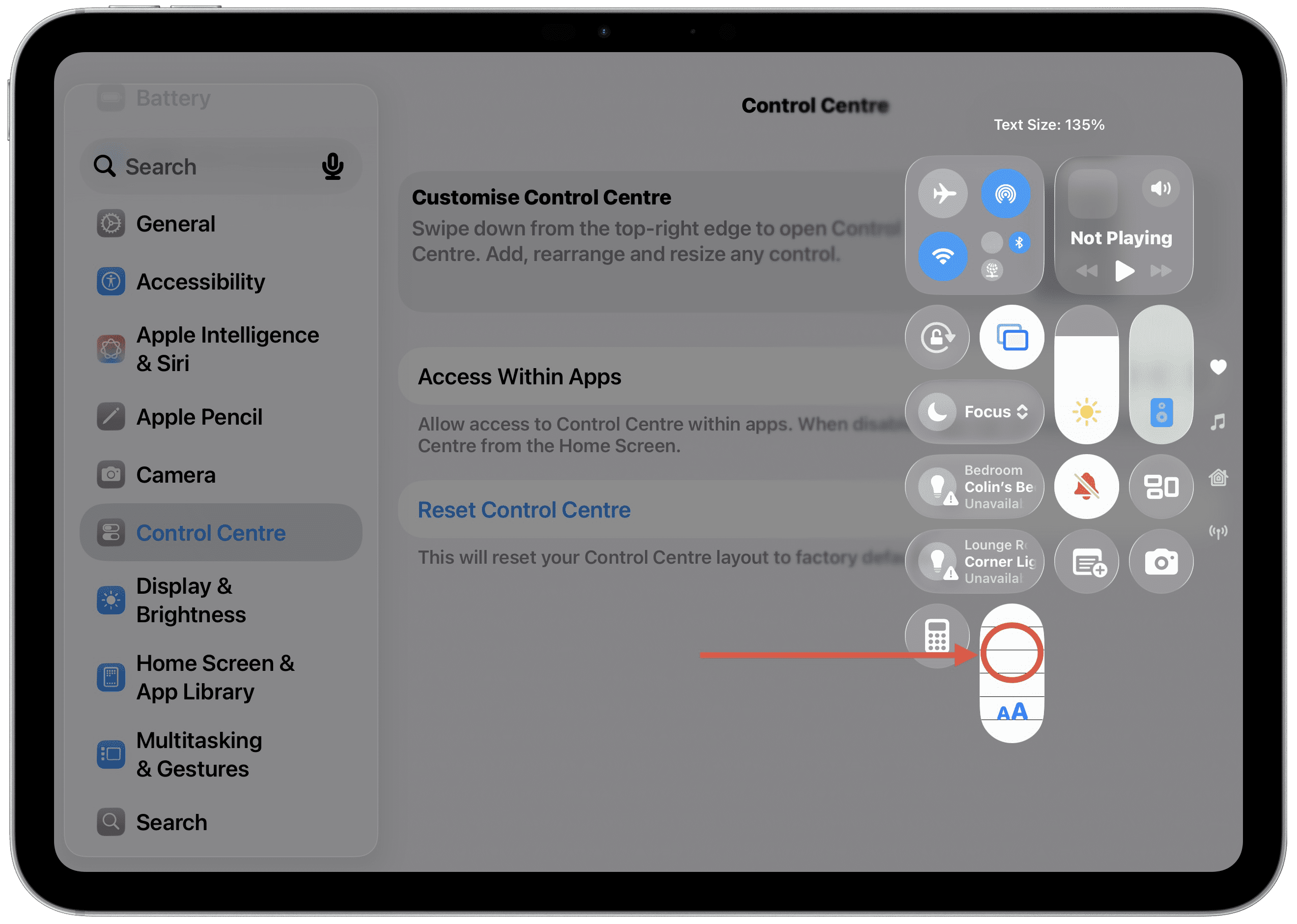 4. Tap the Text Size button and it will move to your Control Centre